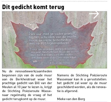 In de krant van 6 maart verscheen het artikel over de renovatie van de muur aan de Berkheistraat waar op al jarenlang het prachtige gedicht van Bill van der Meulen te lezen is. Het was heel mooi vormgegeven door Hendrik Ribot.